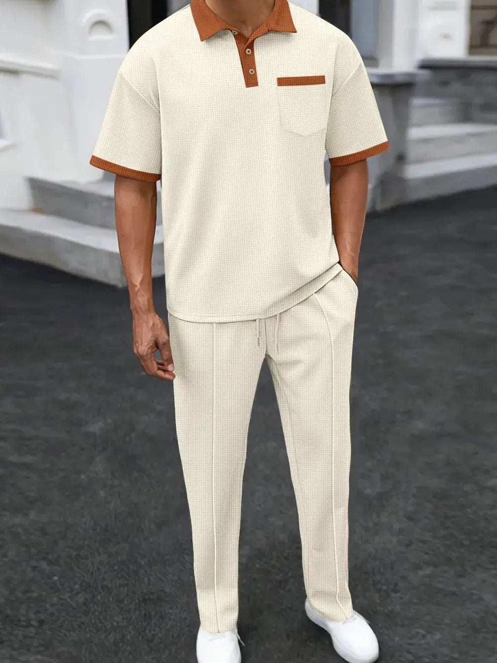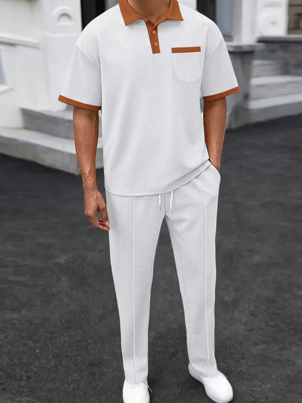 Stay comfortable and stylish in this full-size waffle-knit contrast polo and pants set. Designed for a relaxed fit, this set combines breathable fabric with modern detailing, offering the perfect blend of style and comfort for any occasion.