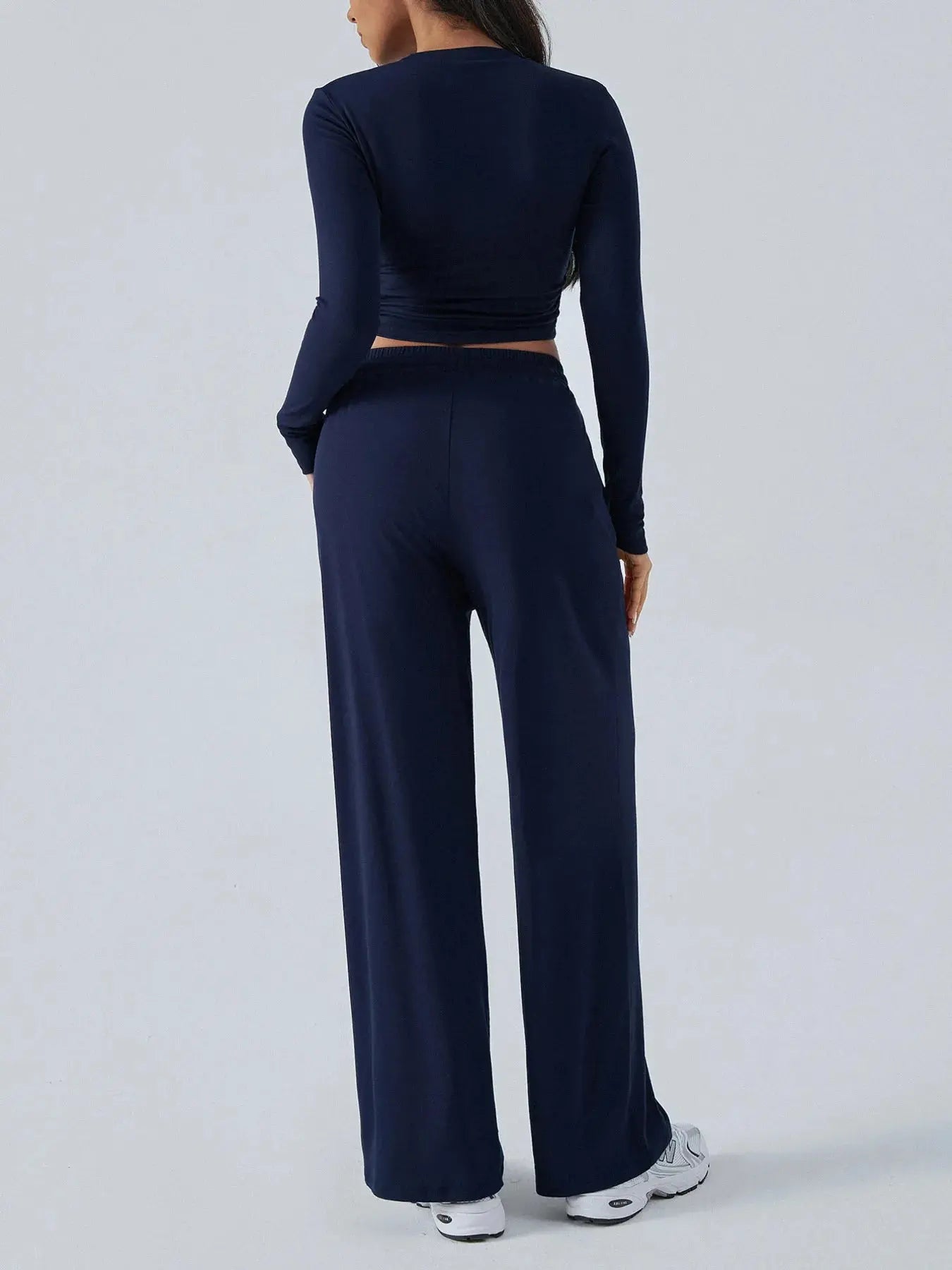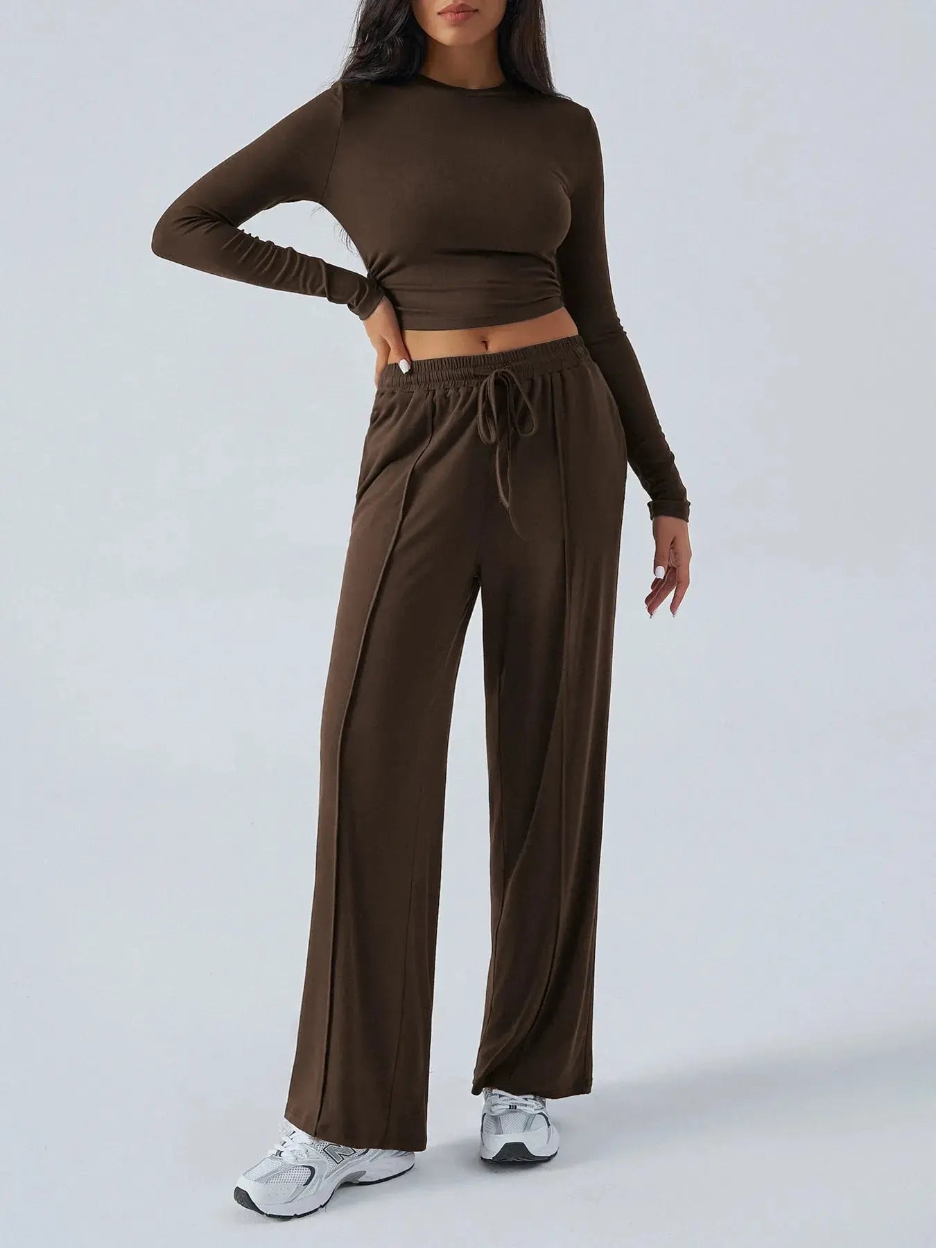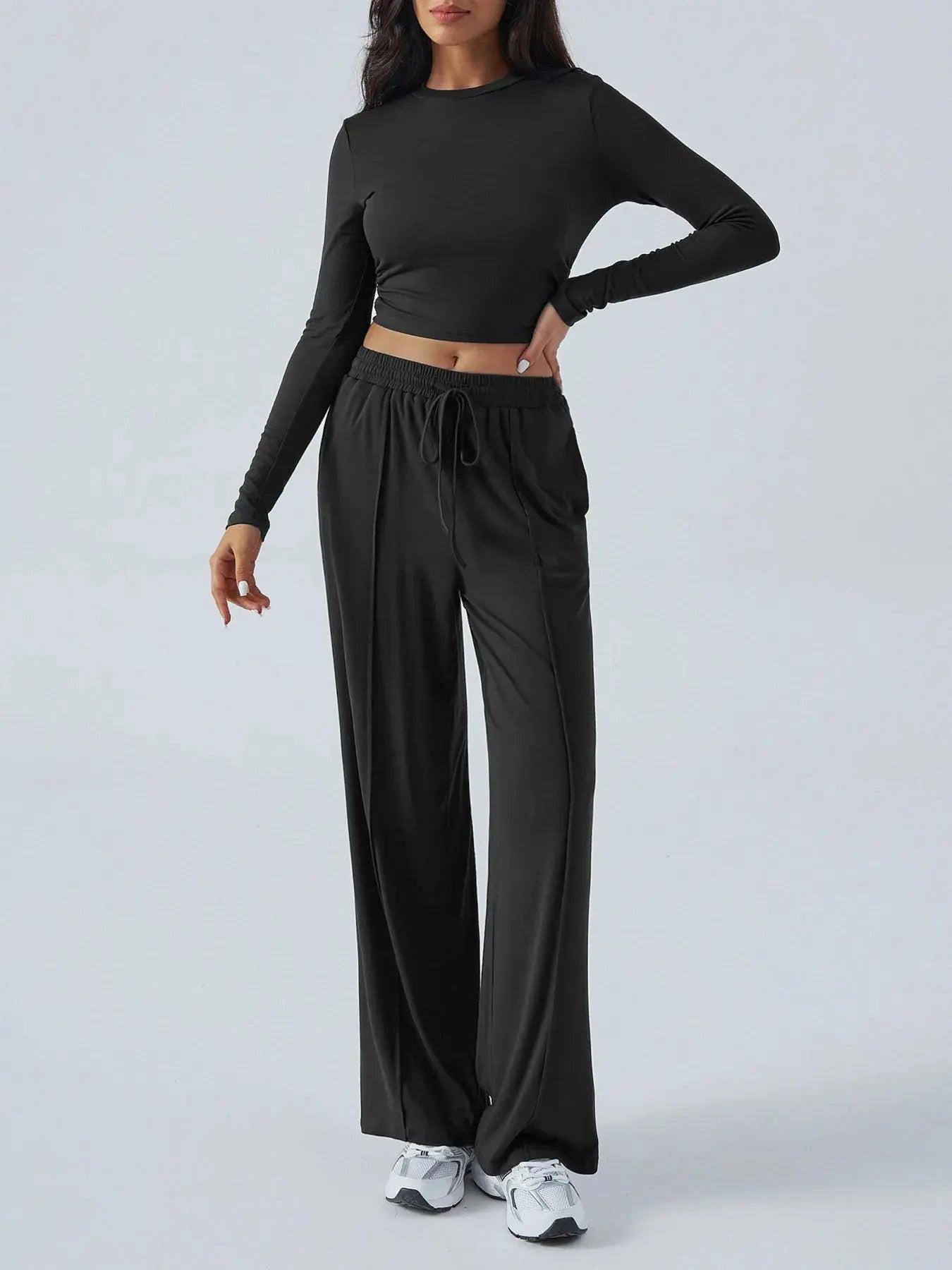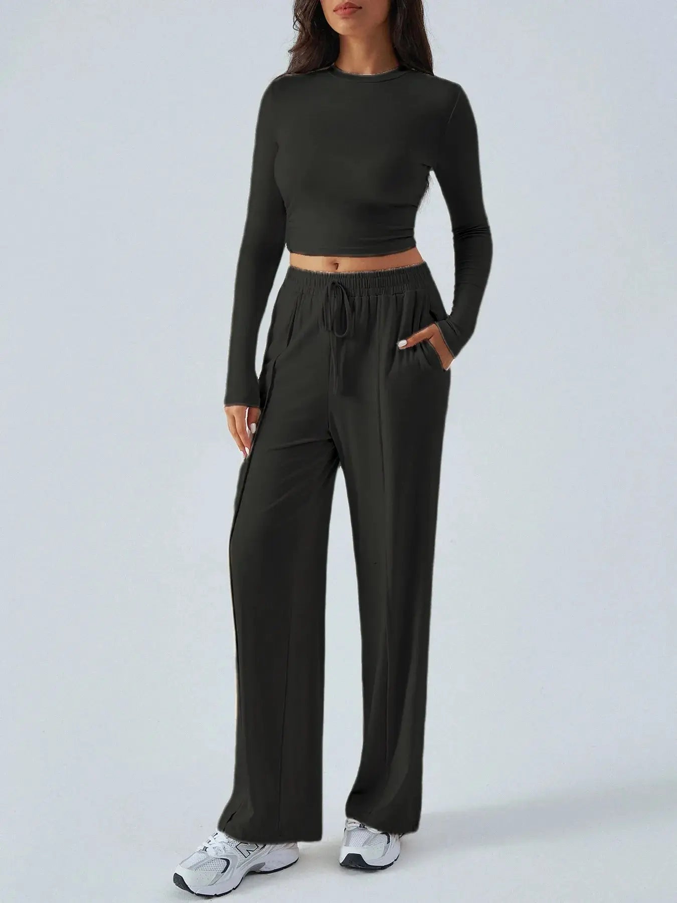 Geef je casual look een boost met deze set met een top en broek met ronde hals en lange mouwen. Gemaakt van zachte, ademende stof, biedt deze set ultiem comfort en een relaxte pasvorm, perfect om in te loungen of gewoon voor elke dag.